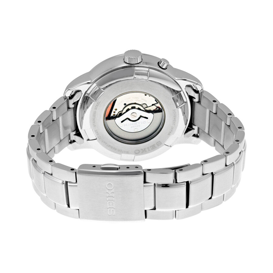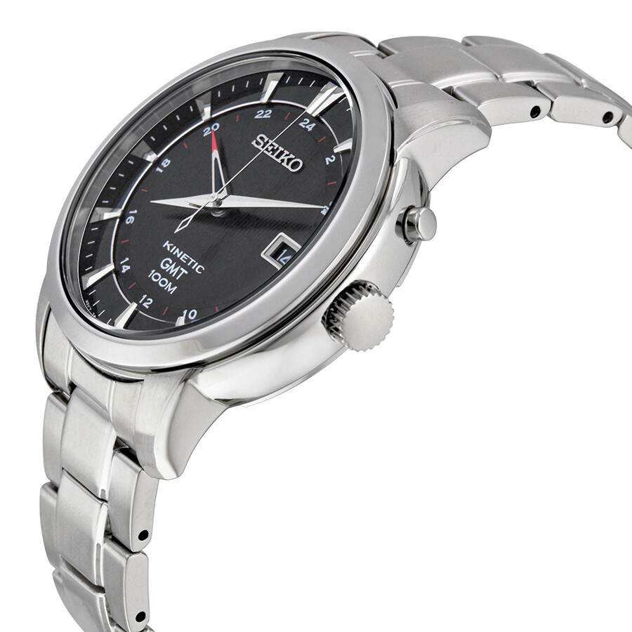 Stainless steel case with a black leather strap. Fixed stainless steel bezel. Black dial with silver-tone hands and index hour markers. 24 hour markers. Minute markers around the outer rim. Dial Type: Analog. Date display at the 3 o'clock position. Kinetic quartz movement. Scratch resistant Hardlex crystal. Case diameter: 43 mm. Case thickness: 13 mm. Round case shape. Band width: 20 mm. Tang clasp. Water resistant at 100 meters / 330 feet. Functions: date, hour, minute, second, GMT. Casual watch style. Seiko Kinetic GMT Black Dial Black Leather Men's Watch SUN033.